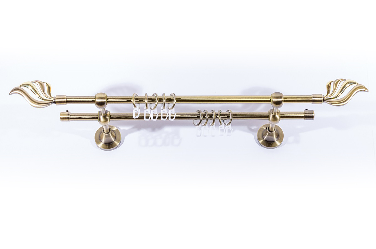 Главная / Каталог / Карнизы / Карнизы металлические для штор / Артметалл двухрядный d16 c наконечниками / Карниз кованый d 16 мм двойной Вингс Старое золото (антик) 3200 мм