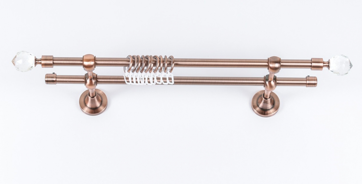Главная / Каталог / Карнизы / Карнизы металлические для штор / Артметалл двухрядный d16 c наконечниками / Карниз Артметалл двухрядный d16 c наконечниками Кристалл Медь 1600 мм