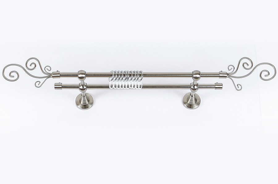Главная / Каталог / Карнизы / Карнизы металлические для штор / Артметалл двухрядный d16 c наконечниками / Карниз Артметалл двухрядный d16 c наконечниками Завиток Нержавеющая сталь 2800 мм