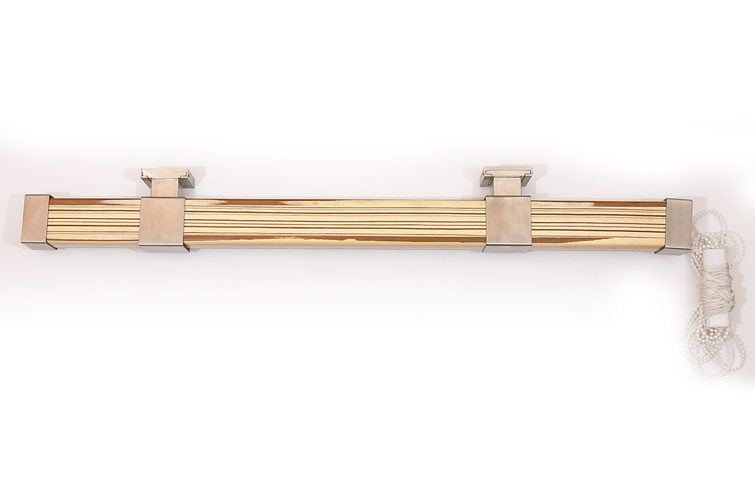 Карниз ДЕРЕВЯННЫЙ для вертикальных жалюзи (стенового крепления): На основе прямоугольного профиля из редкой породы дерева зебрано с подъемно-раздвижным механизмом, со стальными кронштейнами и заглушками в цвет «матовой нержавеющей стали».